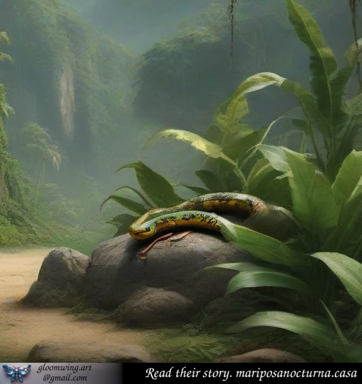 The snake sat on a stone that looked like a green slab, its body gleaming like gold in the sun. Kamari stopped, disoriented. The snake looked at him curiously, and said: "You will find the bull, but only if you allow me to ask why you are looking for him in the rain".